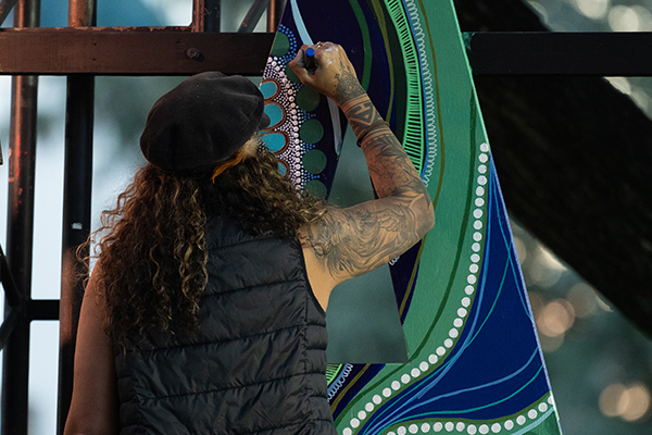 This year’s Mob Word – YARN – will be painted live by four artists together across the weekend. Be sure to come by the Melbourne Street Green and grab a snap with our deadly artists Arabella Walker, Boneta-Marie Mabo, Dean Tyson (Bingkin) and Dylan Bolger!