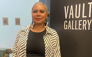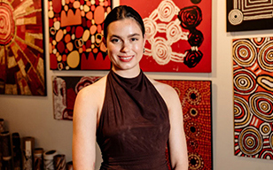 Arabella Walker, represented by Jan Manton Gallery, is an emerging Aboriginal artist from the Wulli Wulli and Auburn Hawkwood people with a background in visual art and dance. She uses vibrant colors and energetic mark-making to express her personal history and connection to First Nations culture.