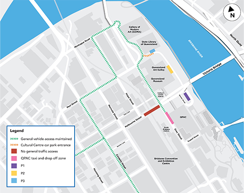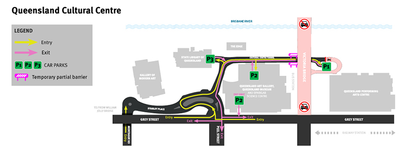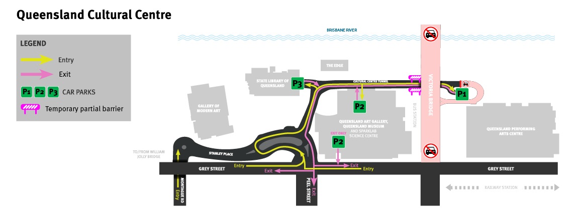 Access to the Cultural Centre car parks is via Stanley Place (alongside the State Library of Queensland) and through the Cultural Centre Tunnel. Stanley Place is accessible by turning right from Grey St travelling north, or by exiting left off the William Jolly Bridge, and also via Montague Rd. There are passenger drop-off zones on both sides of Grey St outside QPAC around the South Brisbane train station.
