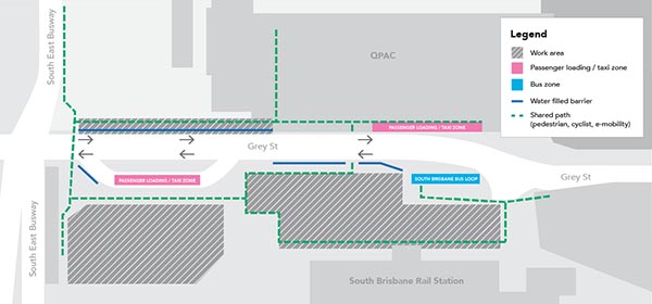 The passenger loading zones and pedestrian access to QPAC have recently changed due to the Brisbane Metro construction works. The Grey St passenger loading and taxi zones are now located further south towards South Bank and there is also now a loading zone on the opposite side of Grey St outside South Brisbane rail station.